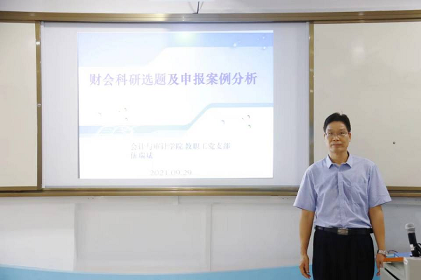 为进一步活跃学术氛围,搭建学术交流平台,提高教师科研水平和科研热情,9月29日19:00,会计与审计学院伍瑞斌教授开展财会科研选题及申报案例分析讲座。