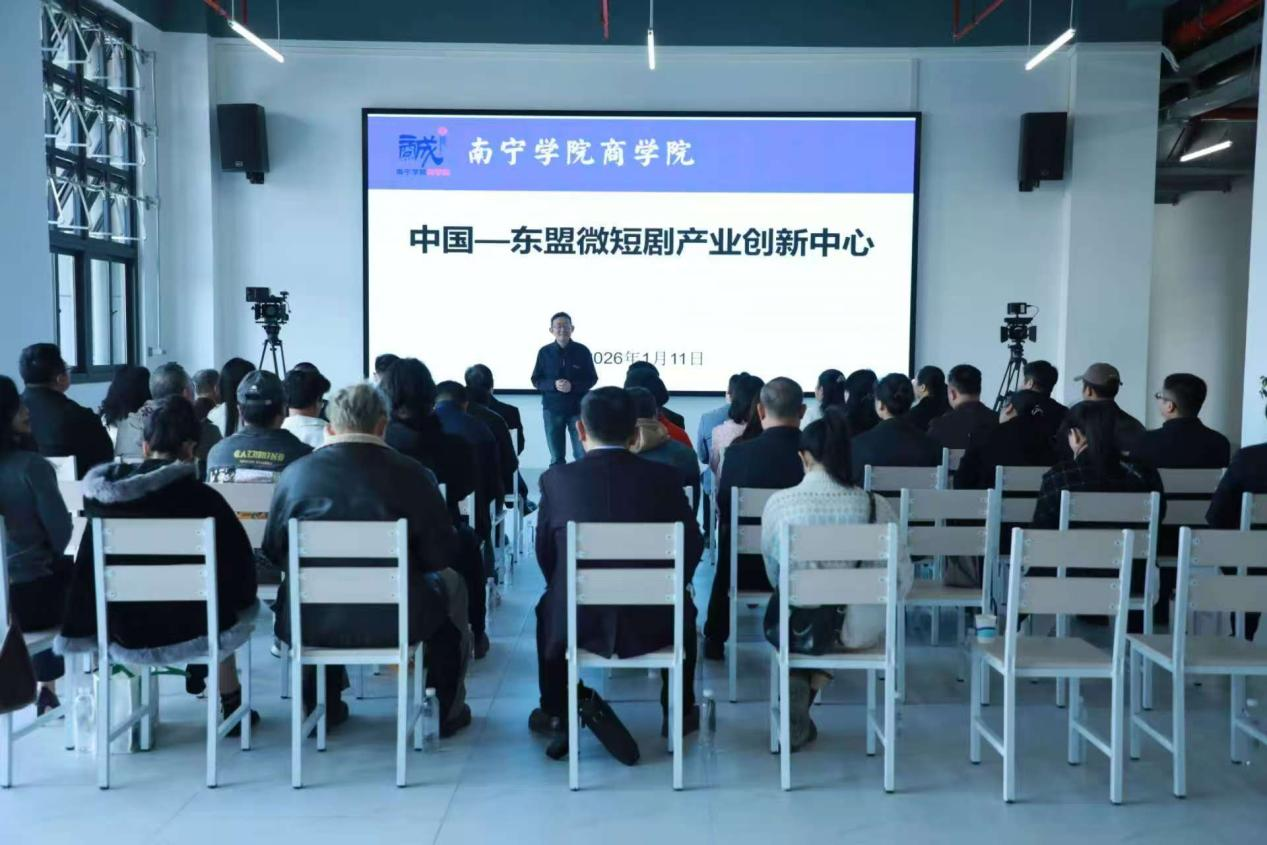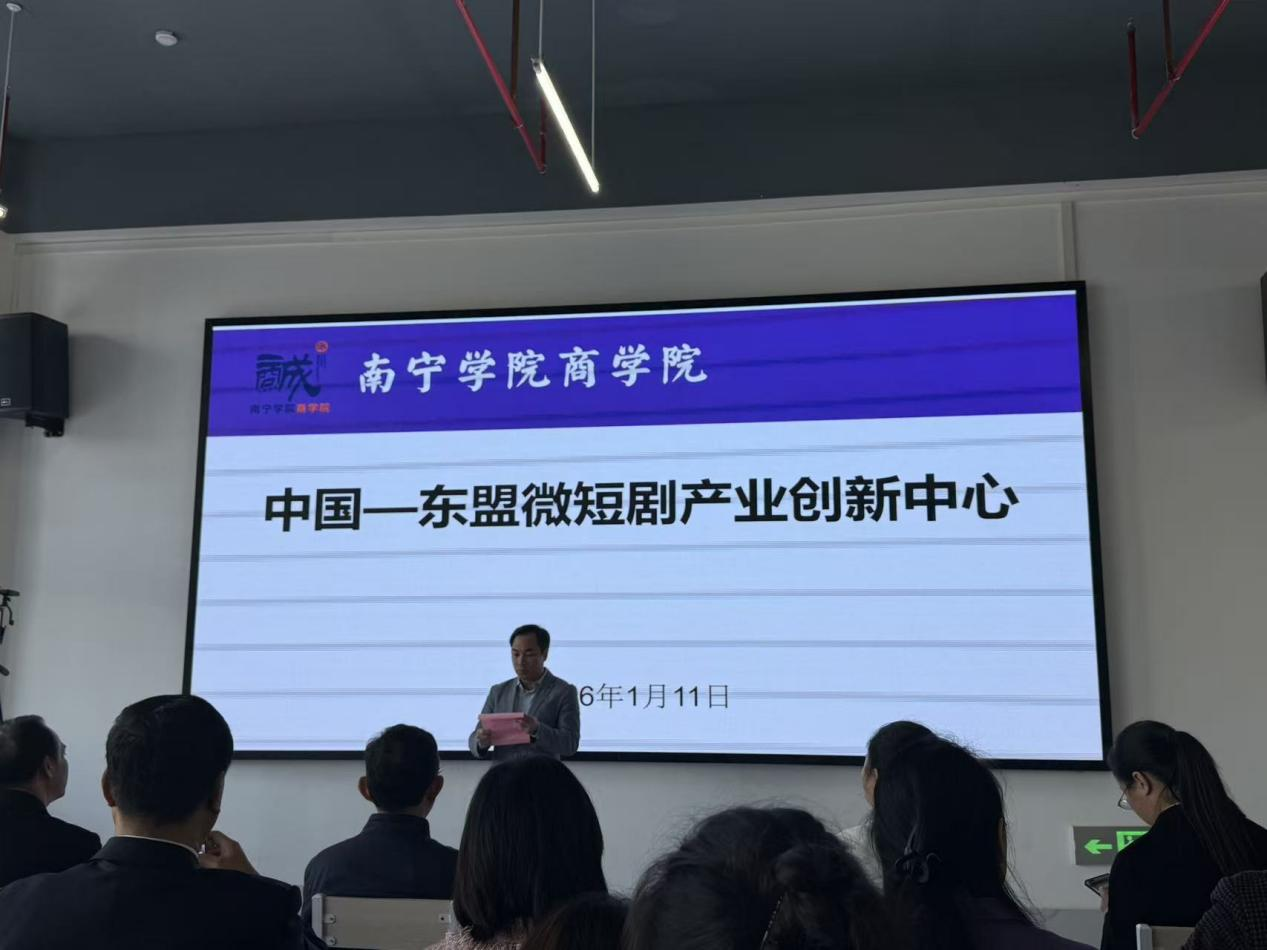 为深化中国—东盟文化交流合作、培育区域文创产业新动能、推动微短剧产业高质量发展,2026年1月11日上午,中国—东盟微短剧产业创新中心揭牌仪式在南宁学院商学院隆重举行。本次活动由南宁学院与广西微短剧产业投资有限公司联合主办,来自政府部门、文化产业界、教育科研机构以及媒体的代表齐聚一堂,共同见证这一推动区域文创产业发展的重要里程碑。
