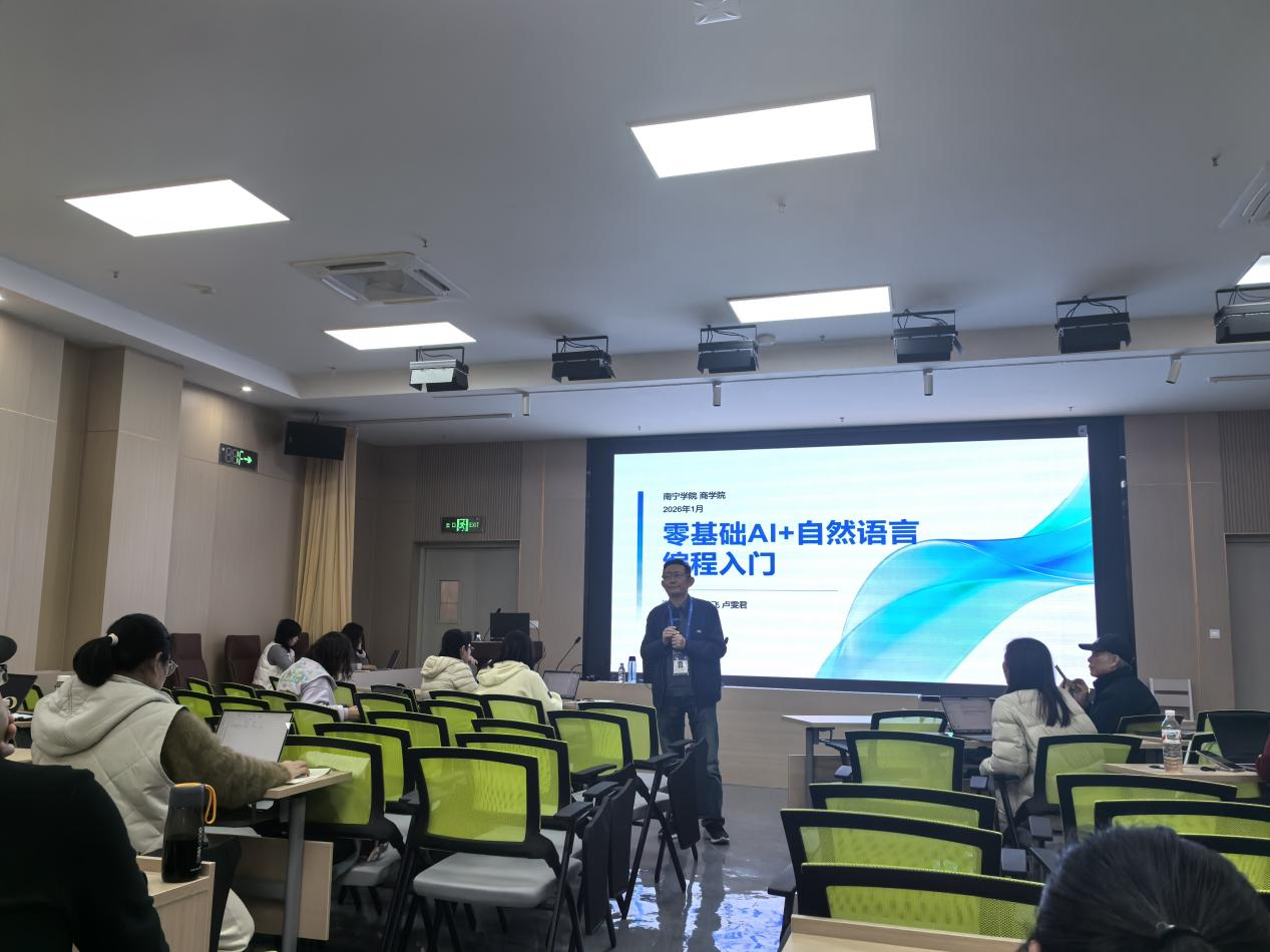 为主动拥抱AI时代浪潮,帮助教职工突破编程技术壁垒,以自然语言编程赋能教学创新与科研提质,2026年1月13日下午,南宁学院商学院在新文科楼102报告厅隆重举办“零基础AI+自然语言编程入门”专题培训第一讲。商学院全体教职工齐聚一堂,共同解锁“用人话指挥计算机”的高效工作新方式。