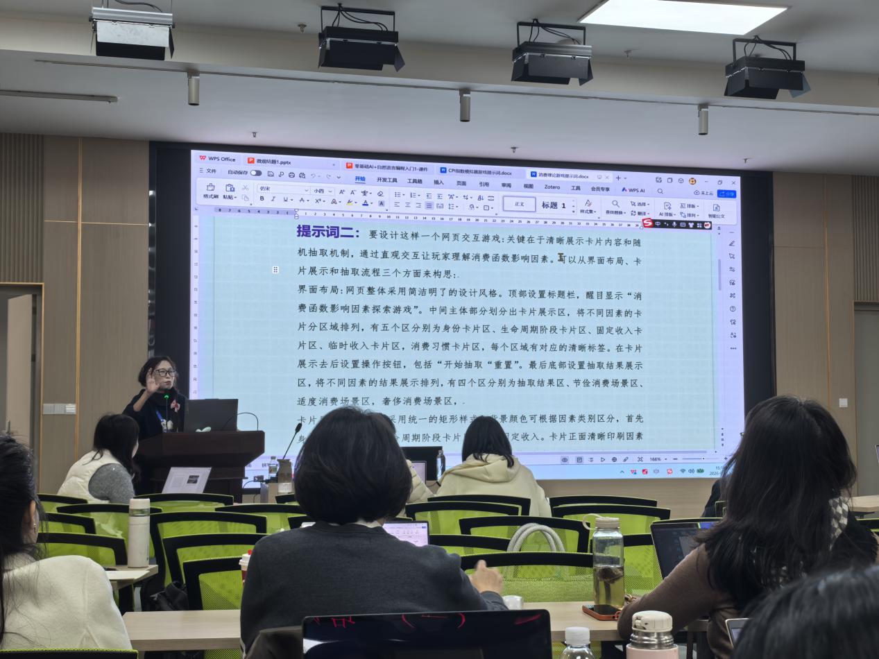 针对消费理论等抽象知识点的教学,卢雯君还分享了课堂随机抽取卡片小游戏的制作流程。从让AI解释理论差异、提供游戏灵感,到精准指令生成网页游戏代码,再到一键下载运行包并灵活调整,全程无需复杂编程基础。她强调,这类互动小游戏既能活跃课堂氛围,又能帮助学生直观理解理论内涵,让枯燥的知识点变得生动易懂。现场教职工跟随演示步骤尝试操作,纷纷表示这种实操性强、贴合教学实际的技巧极具实用价值。