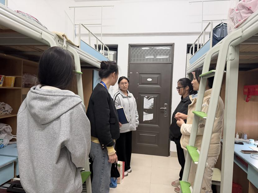 座谈会后,慰问组逐一走访留校学生宿舍。每到一间宿舍,覃副书记都仔细察看同学们的居住环境,关心宿舍设施是否到位、生活用品是否齐全等等。她一边与同学们拉家常,一边结合真实案例,耐心叮嘱假期安全事项。