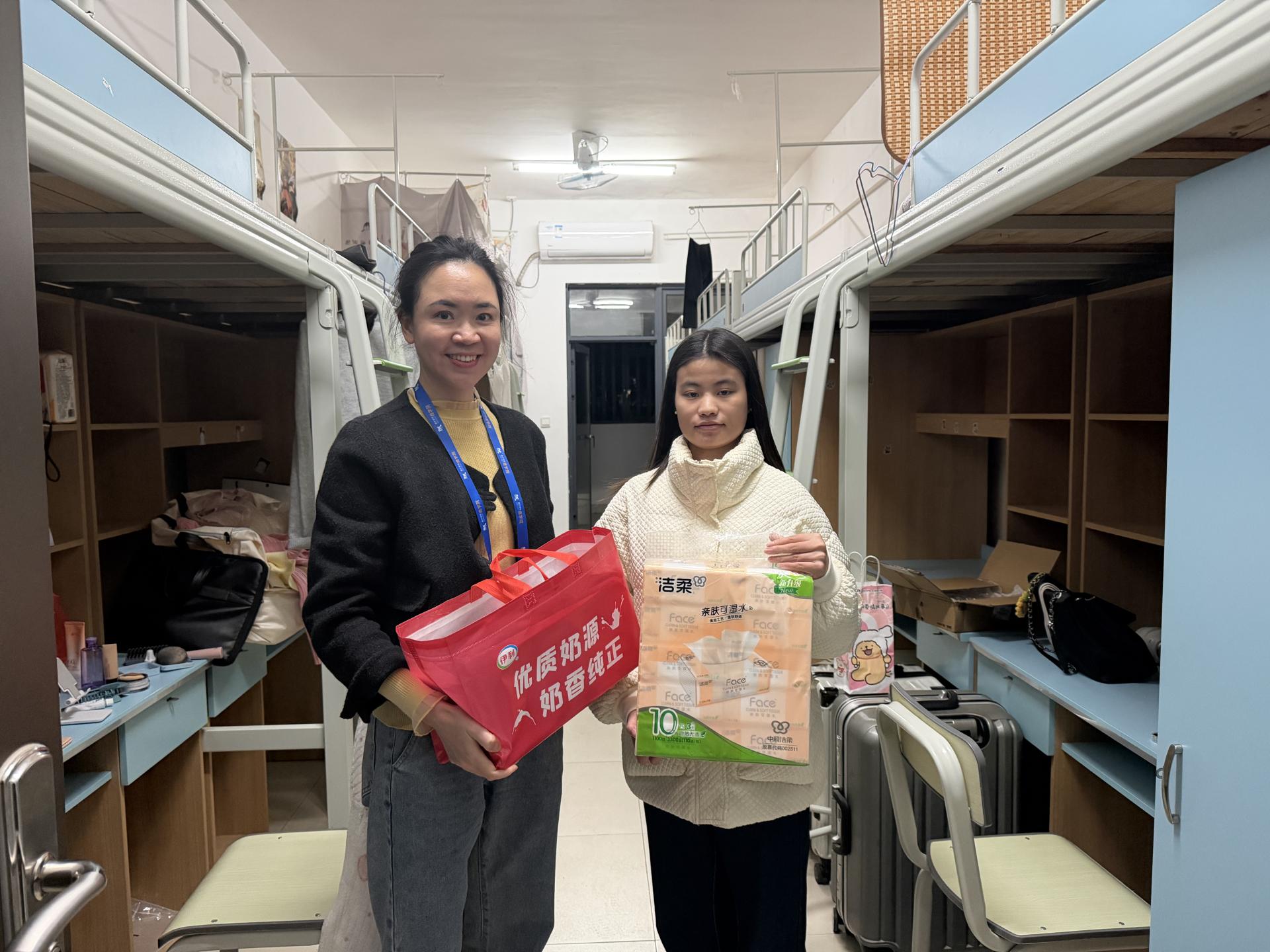 岁序更替,寒意正浓,校园里却涌动着一股暖流。2026年2月11日晚,南宁学院商学院党委副书记覃雪莲与辅导员林月梅老师组成慰问小组深入学生宿舍,开展寒假留校学生走访慰问活动,为学子们送上新春祝福与暖心慰问礼包,用实实在在的行动守护假期平安,助力学子成长。