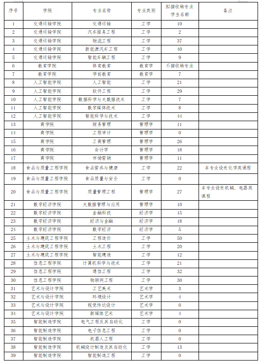 备注:实际接收转专业名额以转专业志愿正式填报时数据为准。