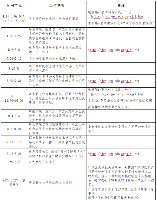 为规范我校全日制学生转专业工作的管理,根据《南宁学院全日制本科生转专业实施细则》(南院教〔2025〕74号)(附件1)的有关规定,结合学校实际,现将2025-2026-2学期2025级学生转专业工作通知如下: