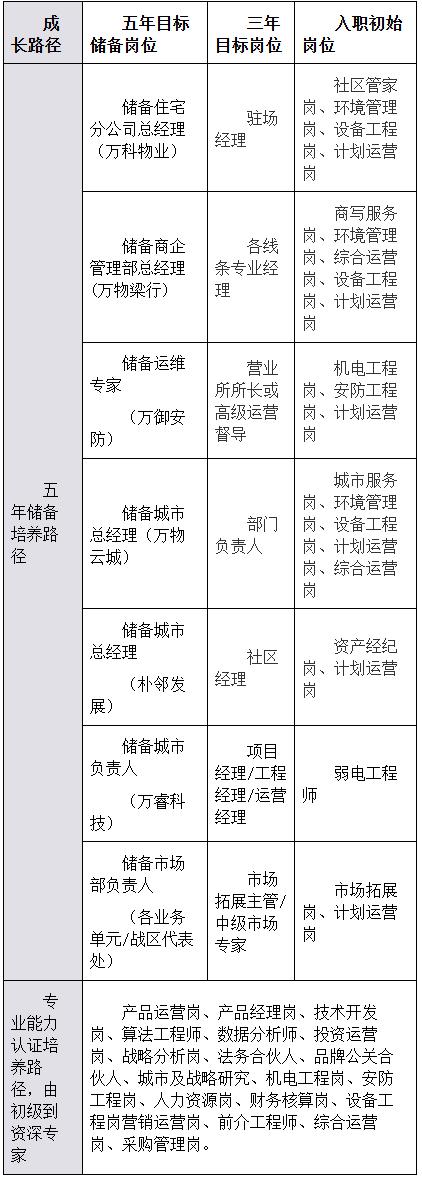 以五年为期,期待加入万物云的VT们,经过现场历练,创造真实价值,在自己所承担的岗位中取得突出战绩,以自己的努力向三年、五年发展目标迈进。目标储备岗位分为经营管理方向、市场方向和专业方向。随着公司每年高速增长发展,更多岗位、更多的五年,更广阔的发展未来待你探寻。