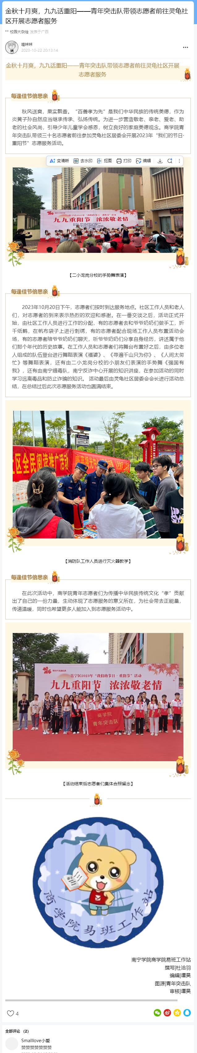 【媒体看商院】易班头条报道金秋十月爽,九九话重阳——青年突击队带领志愿者前往灵龟社区开展志愿者服务