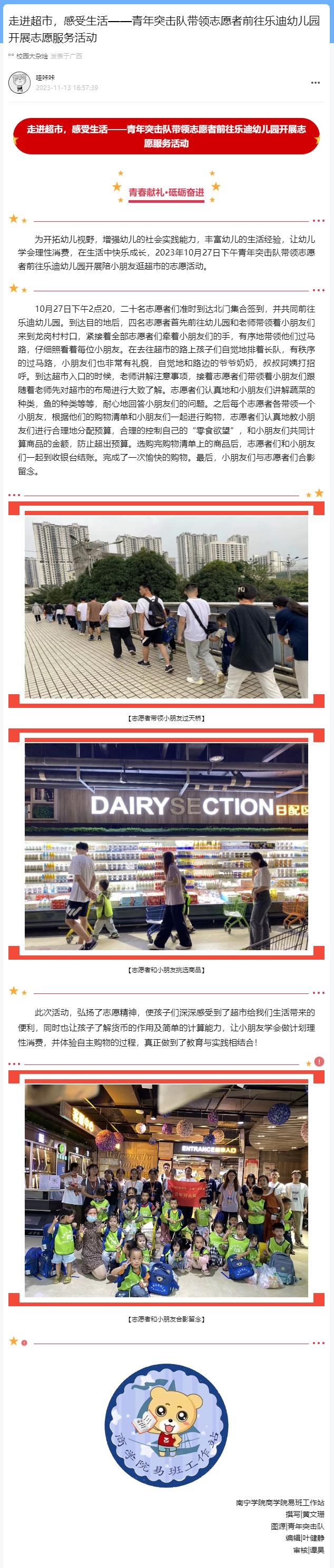 【媒体报道链接】走进超市,感受生活——青年突击队带领志愿者前往乐迪幼儿园开展志愿服务活动https://s.yiban.cn/app/232695/post-detail/RRKSG1pDQLr9RJD