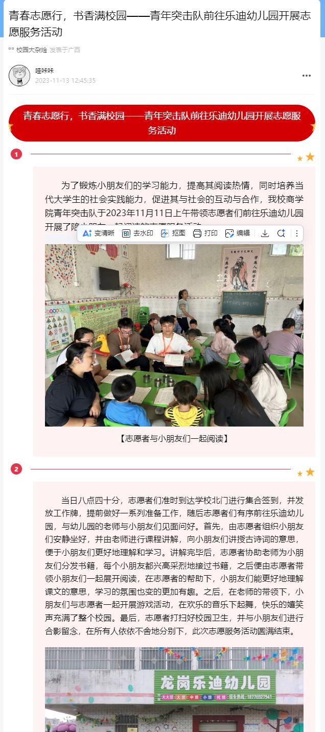 【媒体看商院】易班头条报道青春志愿行,书香满校园——青年突击队前往乐迪幼儿园开展志愿服务活动