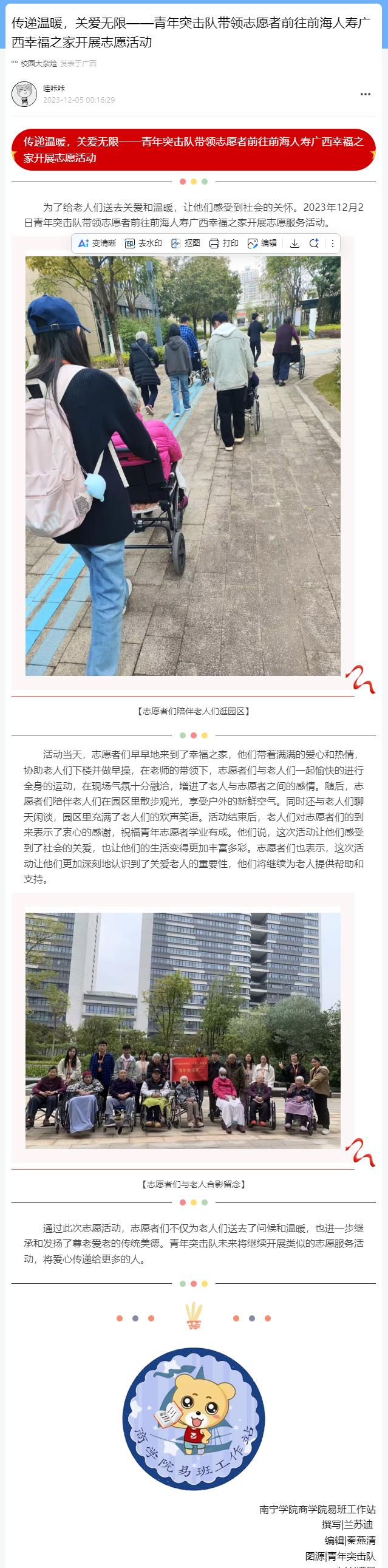 【媒体报道链接】传递温暖,关爱无限——青年突击队带领志愿者前往前海人寿广西幸福之家开展志愿活动https://s.yiban.cn/app/232695/post-detail/y4DI9JgkxoyBJ35