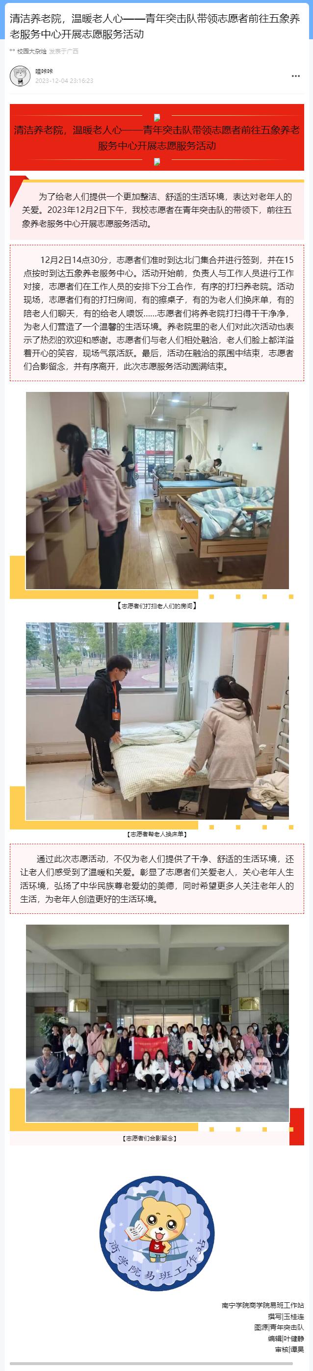 【媒体报道链接】清洁养老院,温暖老人心——青年突击队带领志愿者前往五象养老服务中心开展志愿服务活动https://s.yiban.cn/app/232695/post-detail/bNYSxEyrYLO0W0D
