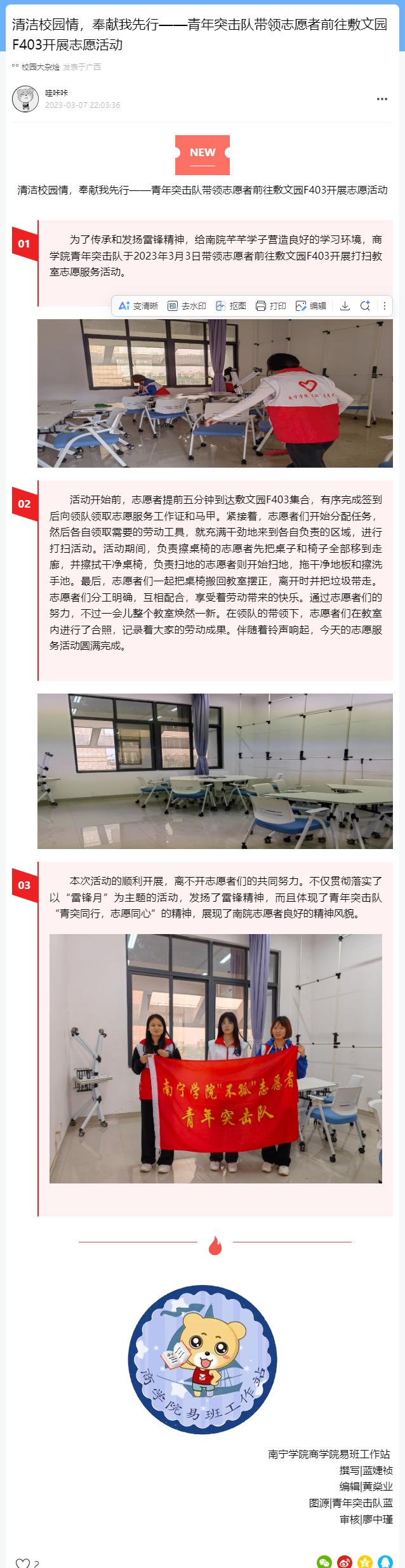 【媒体报道链接】清洁校园情,奉献我先行——青年突击队带领志愿者前往敷文园F403开展志愿服务活动https://s.yiban.cn/app/232695/post-detail/DAKFMyXB6OxEoXx