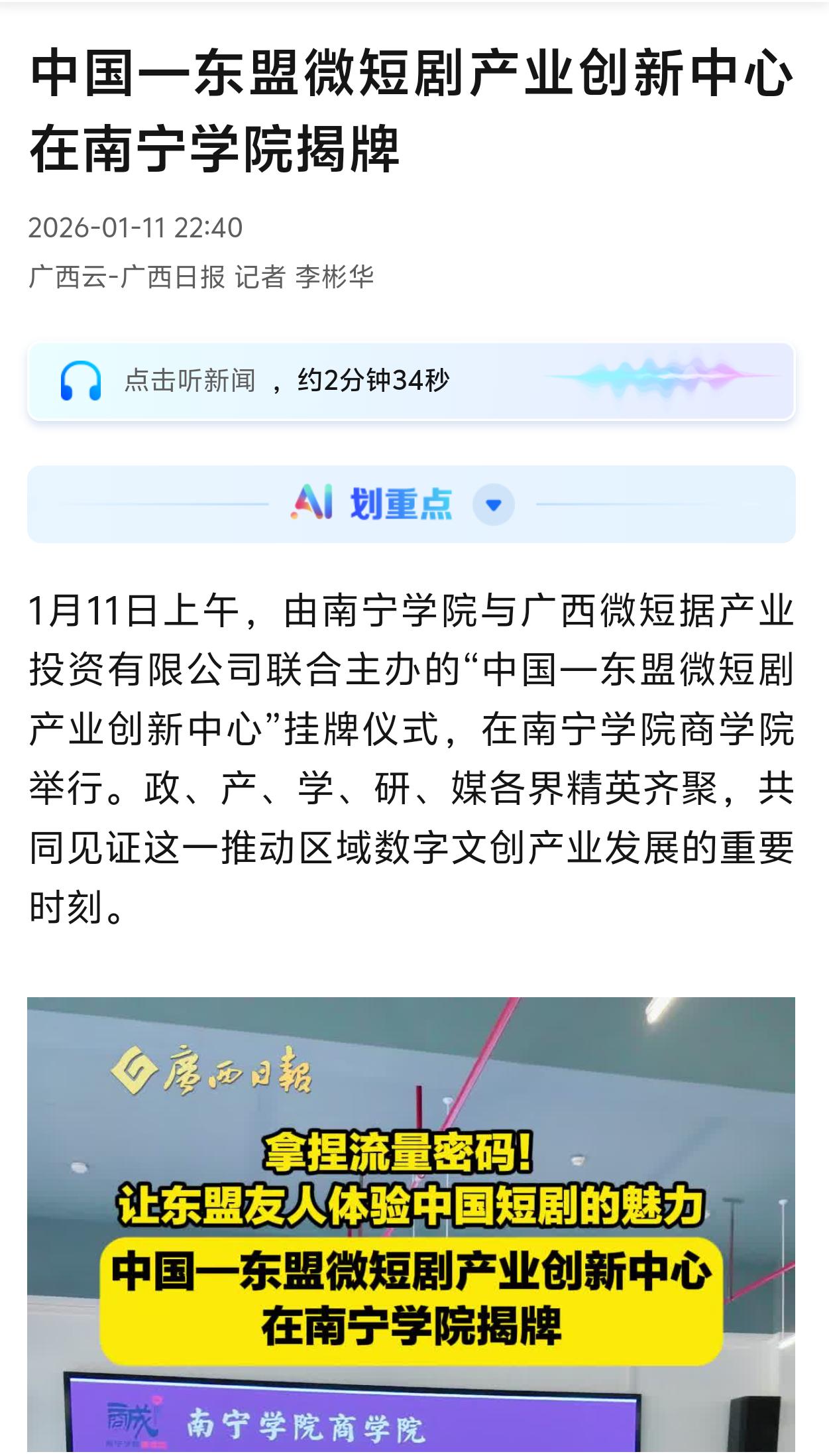 【媒体报道链接】广西日报:中国—东盟微短剧产业创业中心在南宁学院揭牌https://web.cloudgx.cn/news?id=1154273