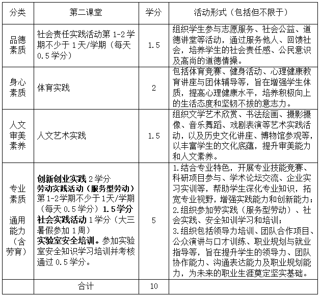 学生在校学习期间应至少获得第二课堂10个学分方可毕业。学生应根据自己的特长和爱好,利用课外时间独立或在教师指导下参与品德素质、身心素质、人文审美素养、专业素质和通用能力等各类实践活动,各模块的学分及活动形式(包括但不限于)见下表: