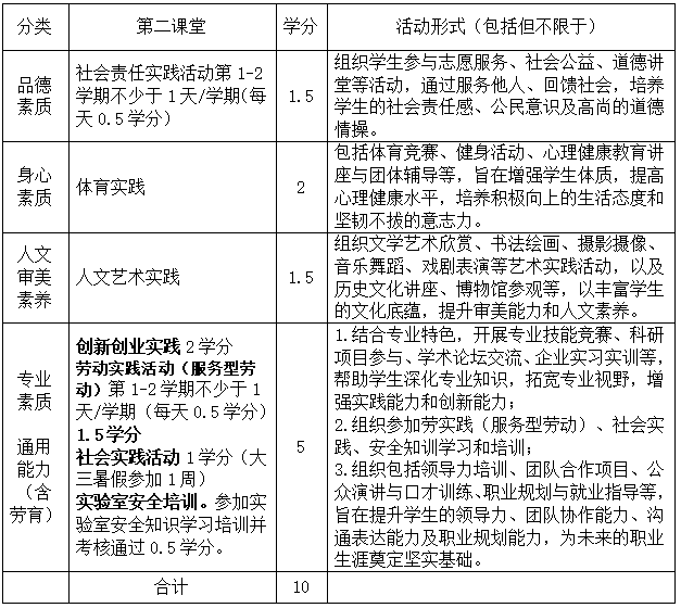 学生在校学习期间应至少获得第二课堂10个学分方可毕业。学生应根据自己的特长和爱好,利用课外时间独立或在教师指导下参与品德素质、身心素质、人文审美素养、专业素质和通用能力等各类实践活动,各模块的学分及活动形式(包括但不限于)见下表:
