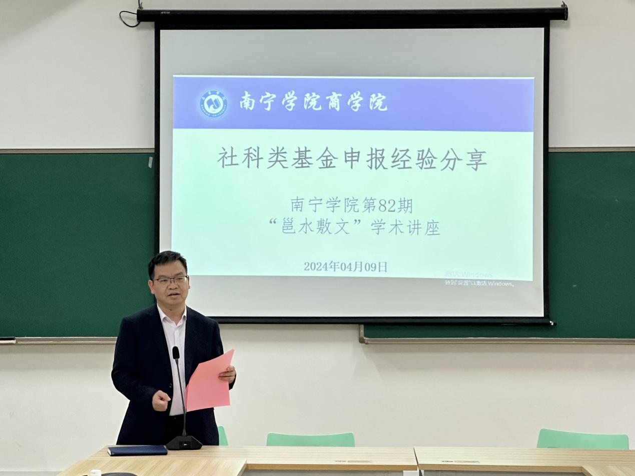 为提高社科类高水平科研项目申报书写作质量,提升青年教师科研能力,202449日下午,南宁学院第82期“邕水敷文”学术讲座在南硅谷B303举行。学校邀请“八桂青年拔尖人才”、“广西高等学校千名中青年骨干教师”、“国家社科基金项目匿名评审专家”、桂林理工大学商学院国际经济系于世海教授作“社科类基金申报经验分享”专题讲座。讲座由商学院副院长蒙永亨教授主持,商学院全体科研骨干教师及数字经济学院部分骨干教师参加。