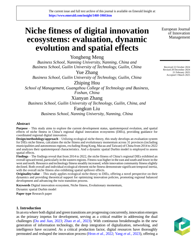在论文发表方面,团队累计发表学术论文50余篇,其中包括20篇核心期刊论文。在高质量论文方面,团队在SCI和SSCI上发表多篇研究成果,涵盖2区1篇、3区3篇。例如《Simulation and Modification of an Ethane-Ethylene Separation Unit Using Vapor Recompression Heat Pump: Energy, Exergy and Economic Analyses》、《Niche Fitness of Digital Innovation Ecosystems: Evaluation, Dynamic Evolution and Spatial Effects》等,展现了良好的国际学术影响力。此外,团队在IEEE系列国际会议等高水平平台上持续发表多篇EI检索论文,研究内容涉及数字经济、智能财务、乡村振兴、高等教育创新等重点领域,形成了理论研究与区域实践相结合的学术特色,体现了团队的科研积累和创新能力。